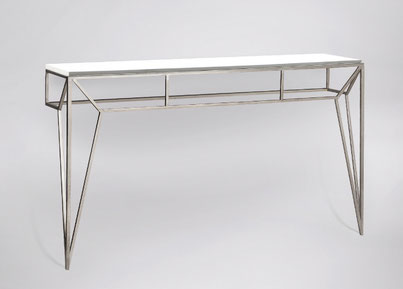 La Console Prisme tire son design du mobilier Art Déco du milieu des années 30. Le fer forgé est structurel, martelé à chaud pendant la forge pour donner un aspect texturé. Dans un style d’époque, le plateau peut être proposé en parchemin laqué sur une structure finition cirée or. Cette pièce sublimera votre appartement et fera rayonner la lumière.