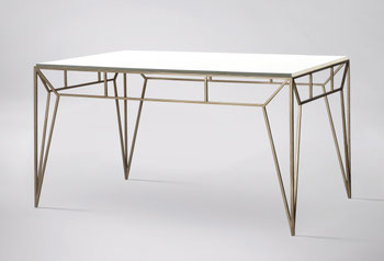 La table prisme tire son design du mobilier Art Déco du milieu des années 30. Le fer forgé est structurel, martelé à chaud à la forge pour donner un aspect texturé. La table Prisme peut être destinée à devenir un bureau, une table basse ou une table à écrire suivant les dimensions souhaitées. Dans un style d’époque, Le plateau peut être proposé en parchemin laqué sur une structure finition cirée or. Cette pièce sublimera votre appartement et fera rayonner la lumière.
