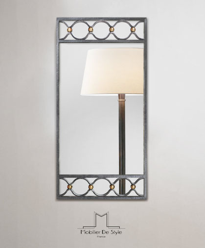 The mirror “Infini” is entirely forged and assembled by hand in our workshop. All pieces are adjusted together with refinement and distinction. This mirror is inspired by the decorative furniture style of the mid-20th century. Its wrought iron frame has a slightly hot hammered texture. The polished brass beads reflect light with elegance. Here presented with finish 1: "Brushed wrought iron"; the wrought iron can contrast even more with the beads thanks to finish 4: "Black painted wrought iron". The “Infini” mirror fits perfectly with the “Infini” cocktail table, to bring to your interior an assumed Art Deco style. Each mirror is coming with a wall mounting system.
